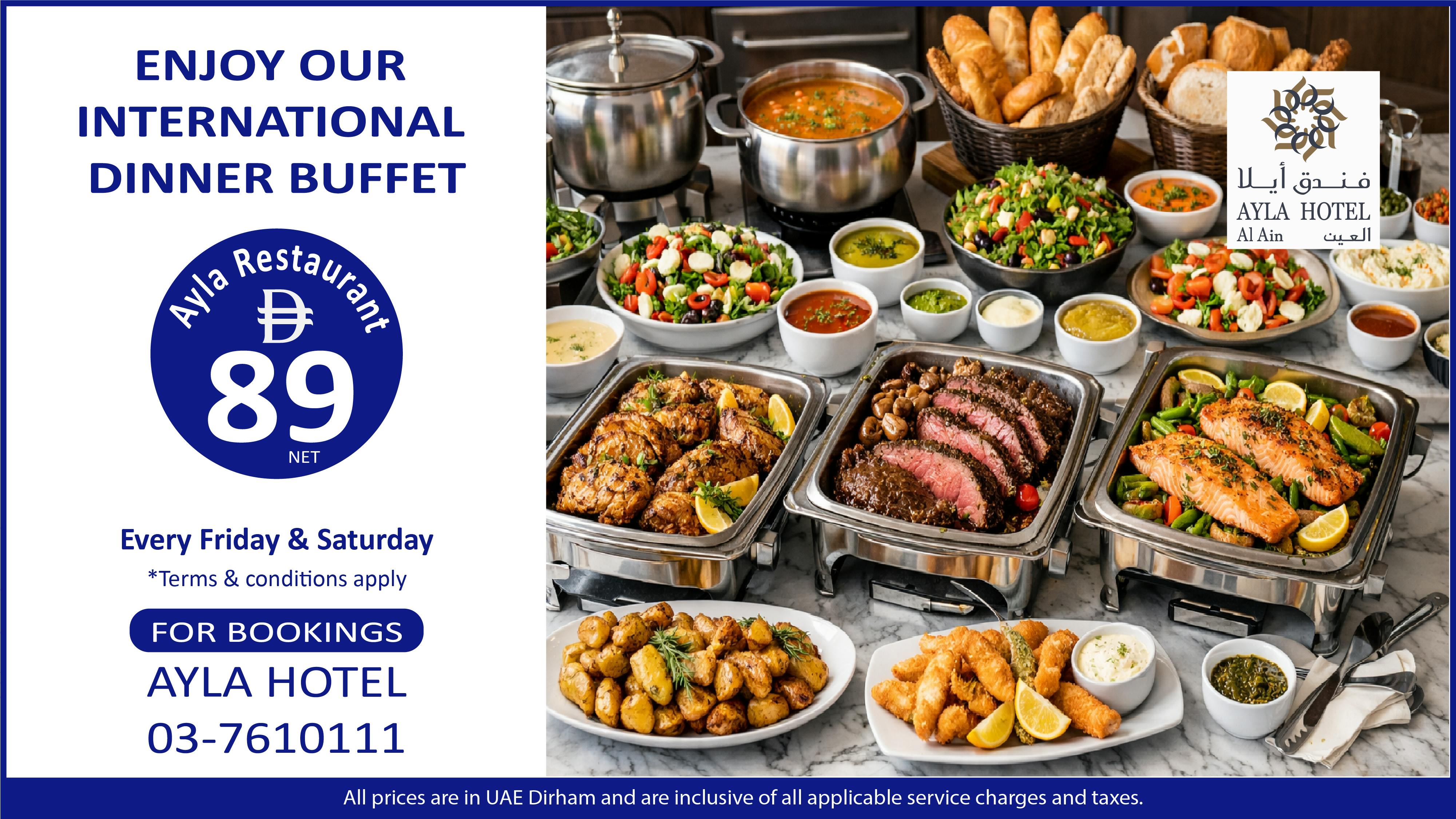 Ayla Hotel - Dinner Special OfferSee all promotionsAED 89 - per person Ayla Restaurant, Ayla HotelFeatured Offers See All Machbous MondayValentine's day Special offer - Pulse Health ClubAl Naeem Spa - valentain's Day PromotionValentain's Day Special BuffetRamadan Iftar BuffetAyla Bawadi Hotel - Lunch Special OfferAyla Hotel - Dinner Special OfferAyla Hotel - Lunch Special Offer